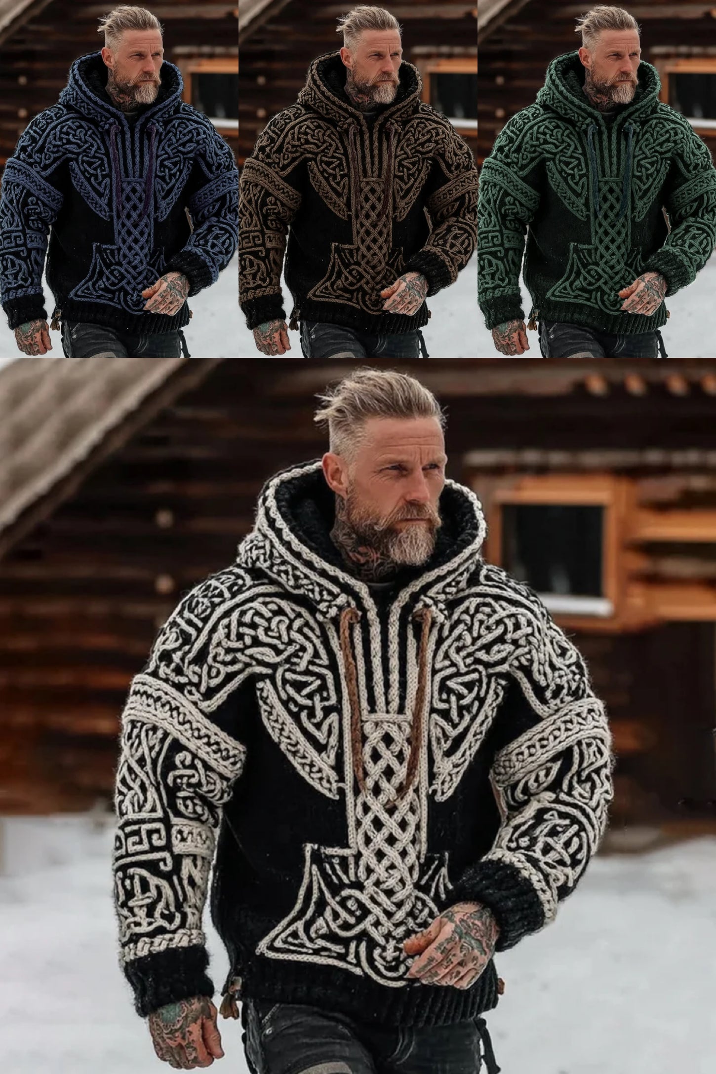 Ten męski sweter z kapturem i zamkiem błyskawicznym jest inspirowany kulturą wikingów oraz celtycką sztuką węzłów, łącząc moc starożytnych symboli z nowoczesnym i praktycznym designem.